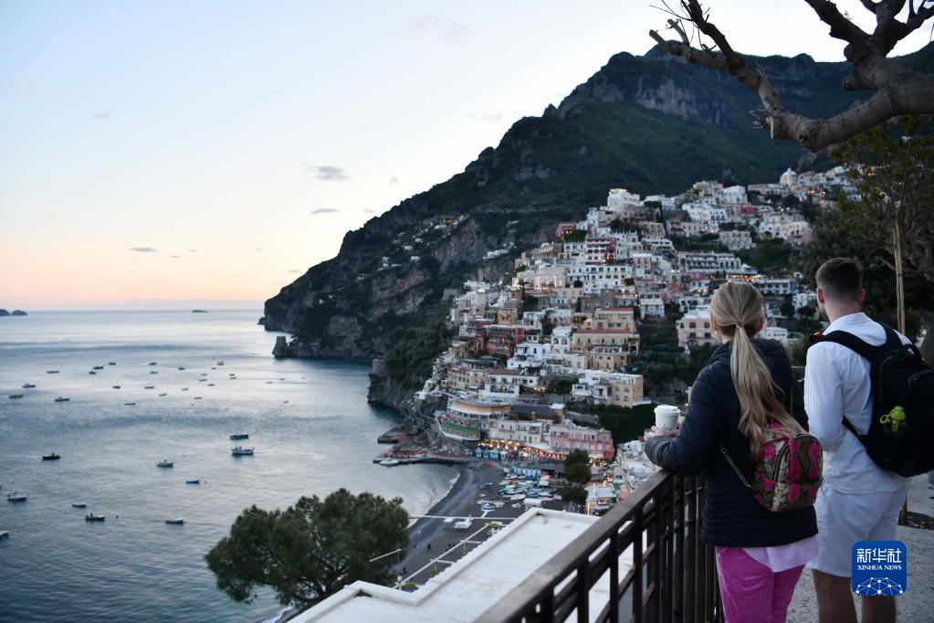 5月3日,游客欣賞落日余暉下的意大利阿馬爾菲海岸線(xiàn)。