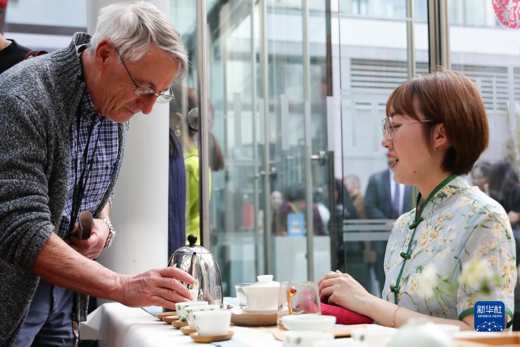 5月4日,一名參觀(guān)者(左)在比利時(shí)布魯塞爾的中國文化中心品茗。
