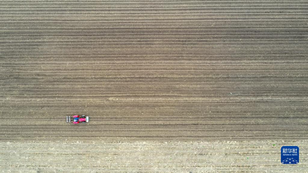 5月5日,在吉林省長(cháng)春市九臺區龍嘉街道水鄉村,農民駕駛農機進(jìn)行春耕作業(yè)(無(wú)人機照片)。