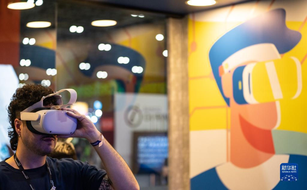 5月4日,在巴西里約熱內盧舉行的里約網(wǎng)絡(luò )峰會(huì )上,一名參會(huì )者在巴西銀行展臺體驗VR設備。