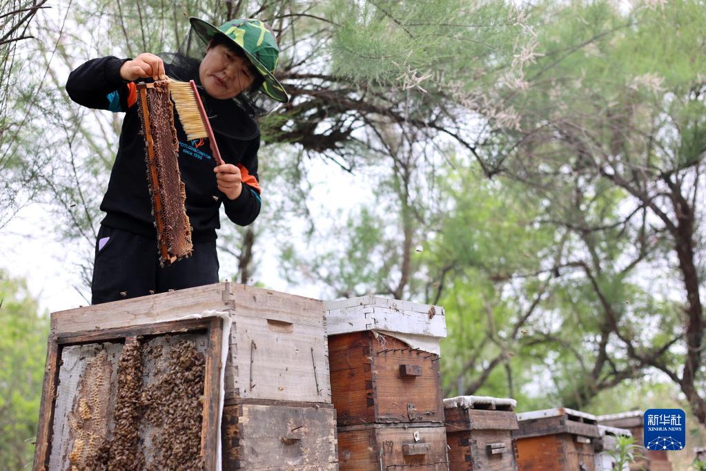 5月5日,山東省濱州市無(wú)棣縣的蜂農在采收蜂蜜。