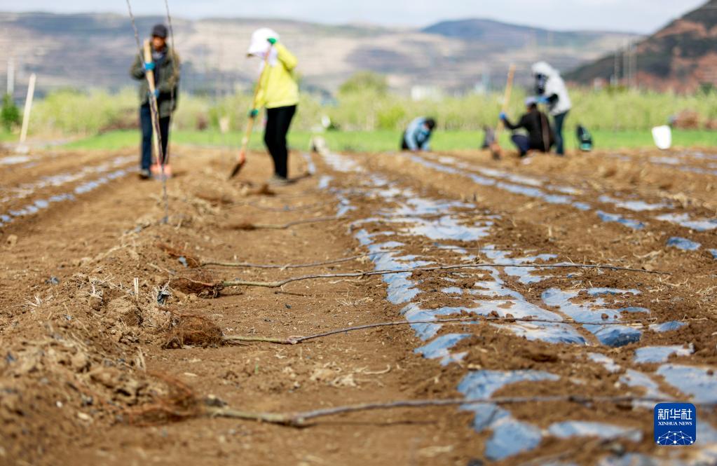5月6日,農民在甘肅省平?jīng)鍪徐o寧縣城川鎮靳寺村果園地里栽種蘋(píng)果樹(shù)苗。