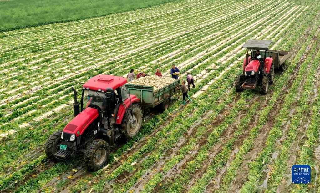 5月6日,村民在四川省眉山市青神縣青竹街道季時(shí)壩村一家庭農場(chǎng)將采收的白蘿卜裝車(chē)(無(wú)人機照片)。