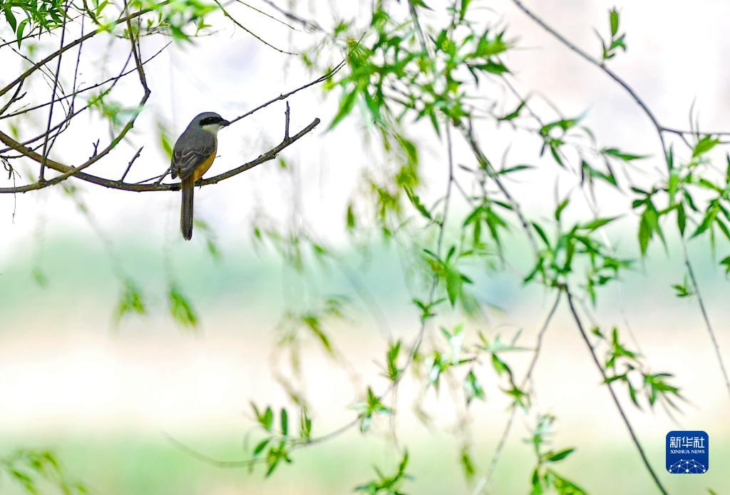 拉魯濕地樹(shù)枝上一只四處觀(guān)望的灰背伯勞(5月6日攝)。