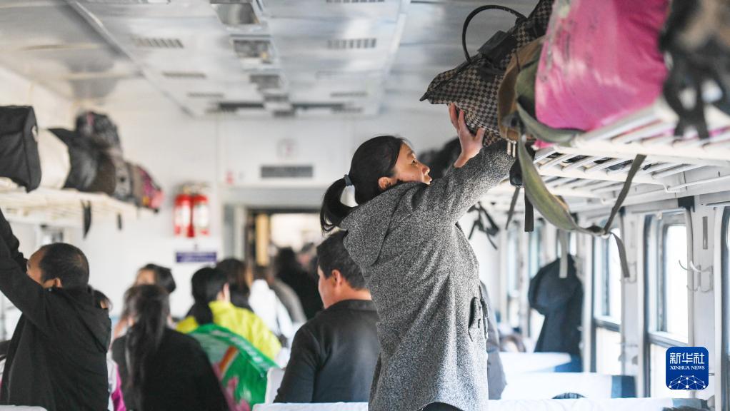 在K5151次列車(chē)車(chē)廂中,一位乘客將行李放置在行李架上(5月6日攝)。
