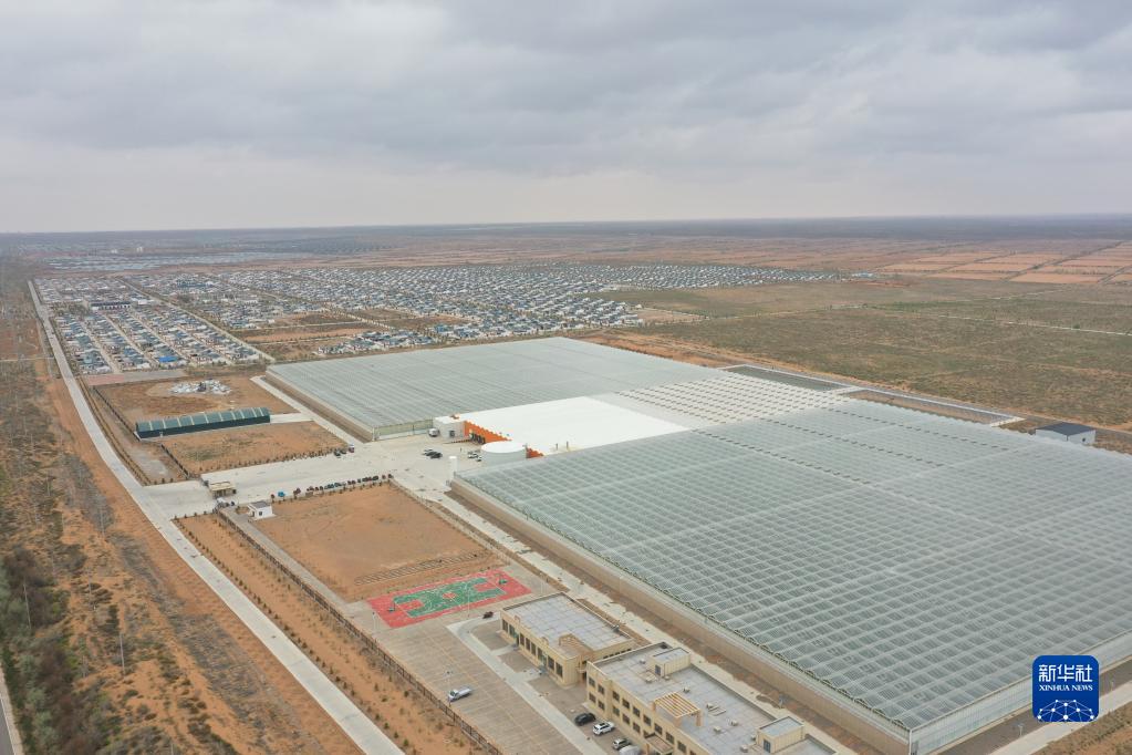 這是2023年5月7日拍攝的智能番茄種植大棚和移民新村(無(wú)人機照片)。