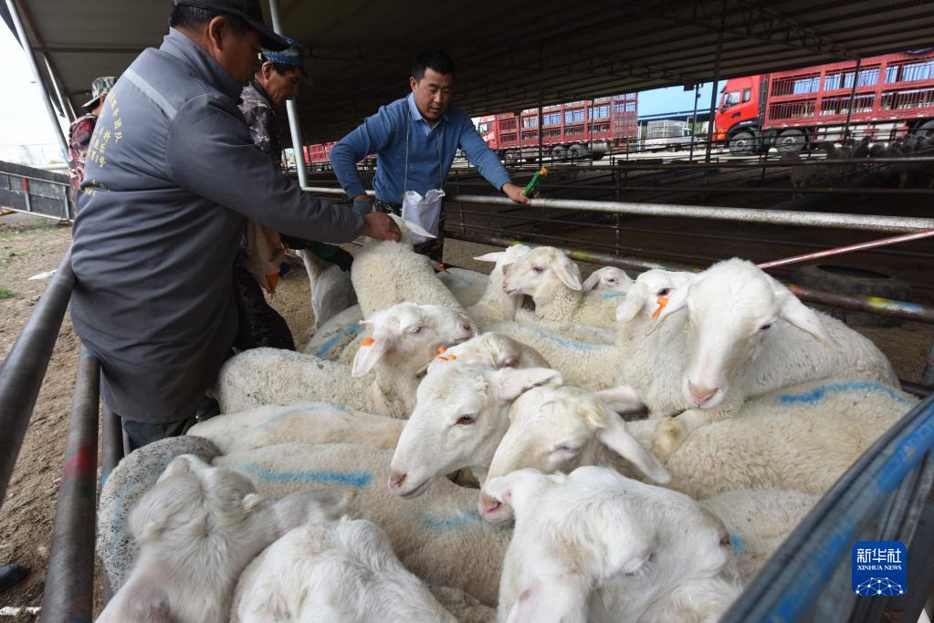 5月7日,在古浪森茂牛羊交易市場(chǎng),工作人員將活羊裝車(chē)。