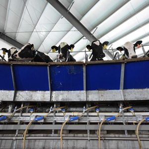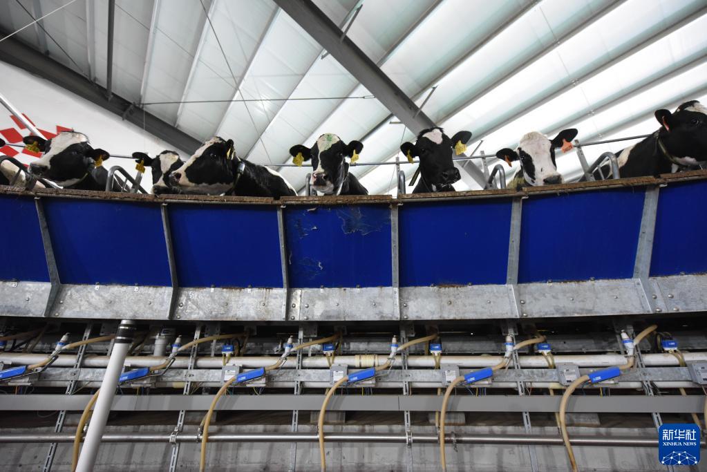 5月7日,在甘肅武威金宇浩睿農牧產(chǎn)業(yè)園,奶牛在轉盤(pán)式擠奶機上產(chǎn)奶。