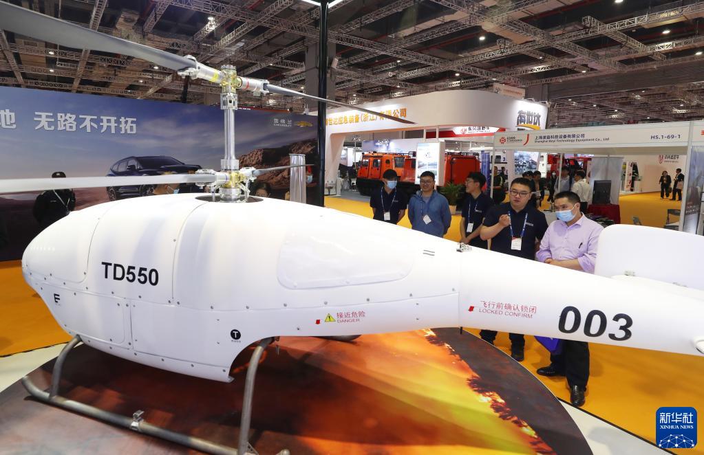5月8日,參觀(guān)者在一架大載重應急救援無(wú)人機旁交流。