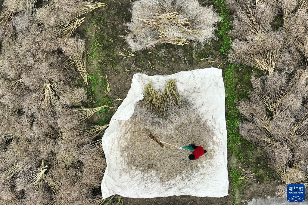 5月8日,重慶市黔江區中塘鎮勝利村村民在進(jìn)行油菜脫籽(無(wú)人機照片)。