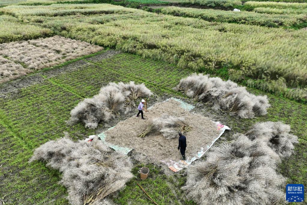 5月8日,重慶市黔江區中塘鎮勝利村村民在進(jìn)行油菜脫籽(無(wú)人機照片)。