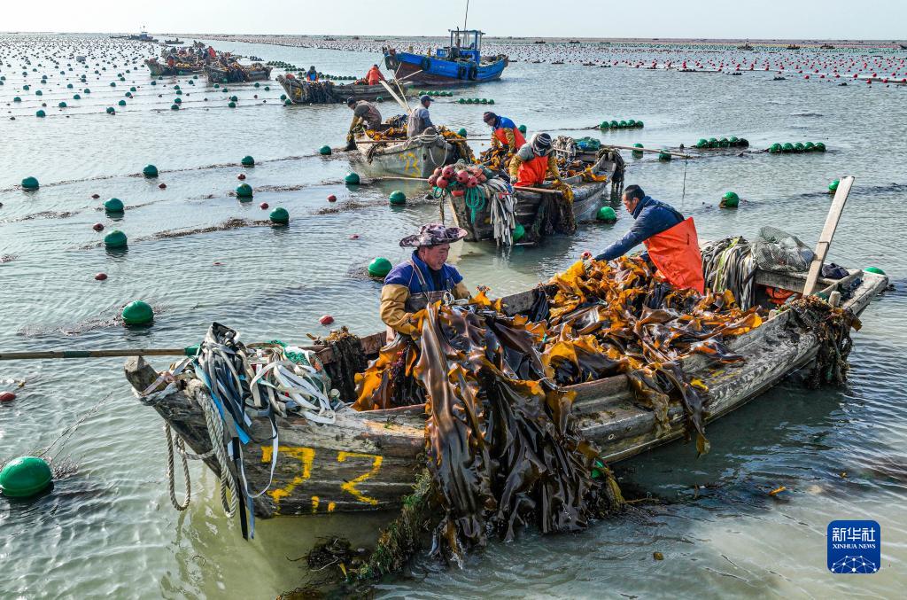 5月8日,在山東省榮成市愛(ài)倫灣海域海帶養殖區,漁民采收海帶(無(wú)人機照片)。