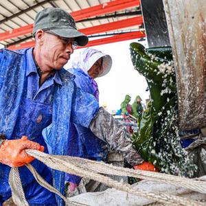 眼下,山東省榮成市正值海帶采收、加工旺季,養殖工將采收的海帶運到鹽漬海帶生產(chǎn)車(chē)間進(jìn)行加工。