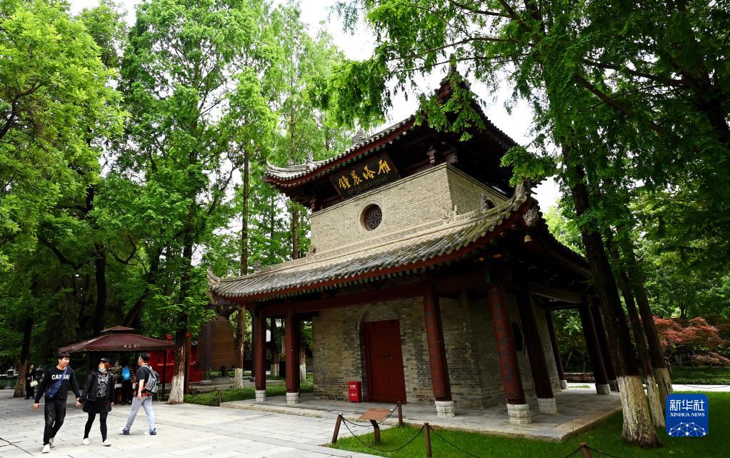 游客經(jīng)過(guò)西安薦福寺鐘樓(5月8日攝)。薦福寺鐘樓內的古鐘與小雁塔曾一起形成了“關(guān)中八景”之一的“雁塔晨鐘”。