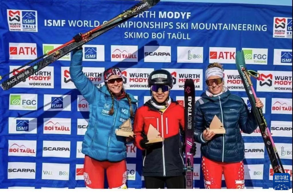 在西班牙加泰羅尼亞舉行的2023滑雪登山世錦賽上,冠軍中國運動(dòng)員玉珍拉姆(中)在女子U20組短距離項目頒獎儀式上(2月28日攝)。新華社發(fā)