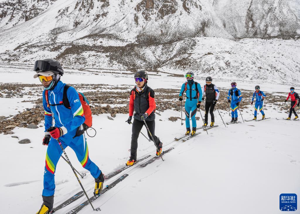 在西藏拉薩市當雄縣羊八井鎮,玉珍拉姆(左二)和隊友進(jìn)行滑雪登山訓練(5月2日攝)。新華社記者 孫非 攝