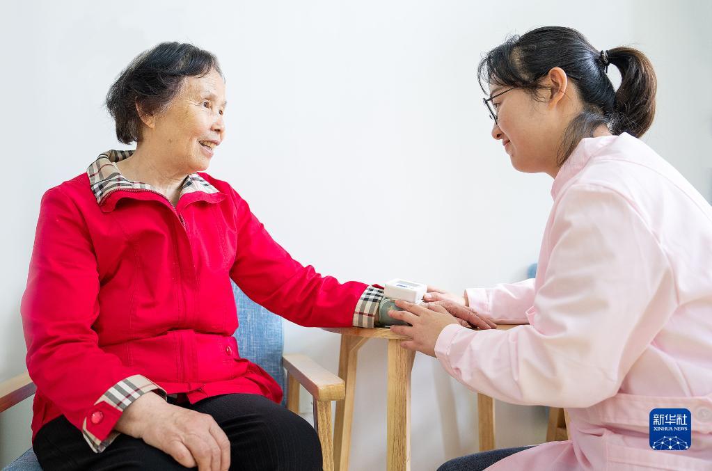 5月9日,在江西省南昌市青云譜區三家店街道南蓮社區嵌入式養老院,護士在給曾玉珍老人測量血壓。