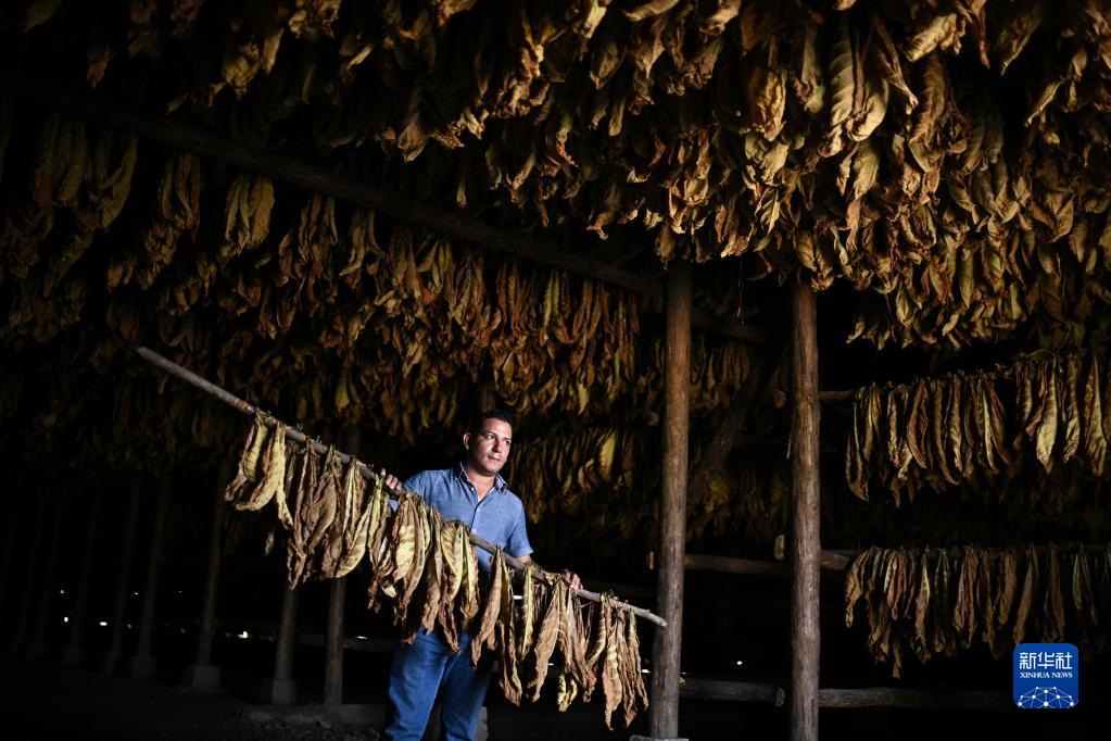 5月8日,在洪都拉斯南部城市丹利的一家雪茄煙葉種植園,工人在晾曬房里晾曬煙葉。