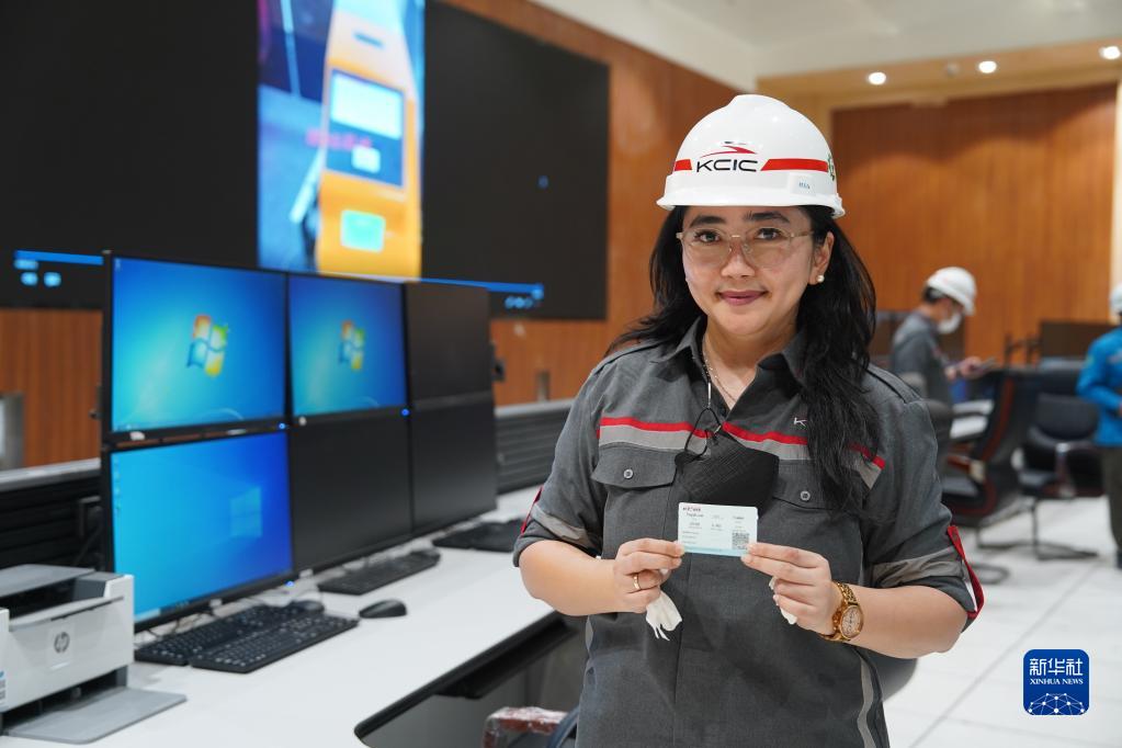 5月8日,在印度尼西亞萬(wàn)隆雅萬(wàn)高鐵調度大廳,印尼中國高速鐵路有限公司客票系統負責人萊尼展示印有自己名字的雅萬(wàn)高鐵樣票。