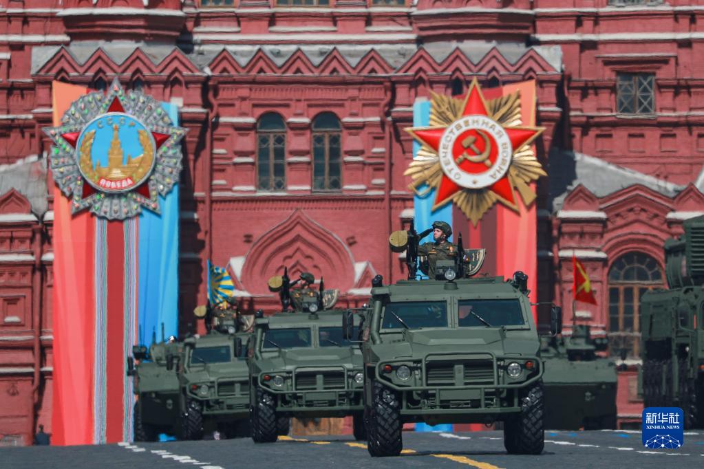 5月9日,在俄羅斯首都莫斯科,軍車(chē)編隊駛過(guò)紅場(chǎng)。
