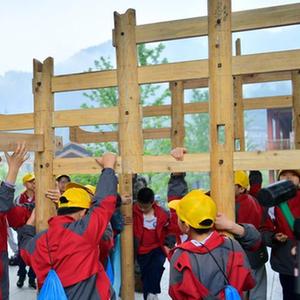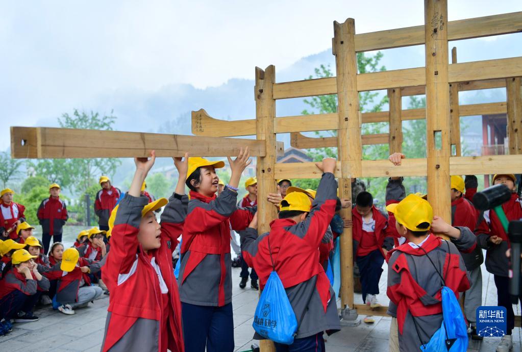 5月9日,宣恩縣第三民族實(shí)驗小學(xué)的學(xué)生在彭家寨參與“營(yíng)造吊腳樓”體驗活動(dòng)。