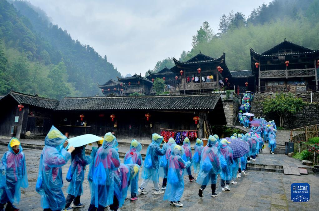 5月9日,宣恩縣第三民族實(shí)驗小學(xué)的學(xué)生參觀(guān)彭家寨古吊腳樓。