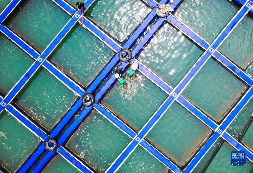 5月9日,在福建寧德三都澳東沖口海域新型養殖漁排上,養殖戶(hù)投放大黃魚(yú)魚(yú)苗(無(wú)人機照片)。
