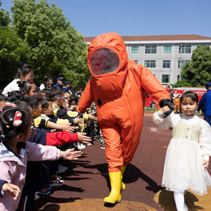 5月9日,浙江省諸暨市姚江鎮應急消防救援站的消防員(右二)與該鎮直埠幼兒園的孩子們互動(dòng)。