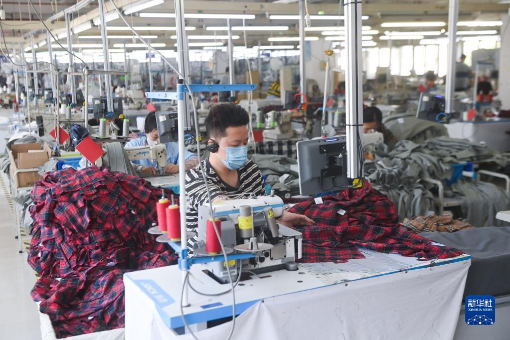 5月10日,在位于湖州市吳興區織里鎮的弗蘭尼爾(湖州)服飾有限公司生產(chǎn)車(chē)間內,工人在流水線(xiàn)上生產(chǎn)童裝。