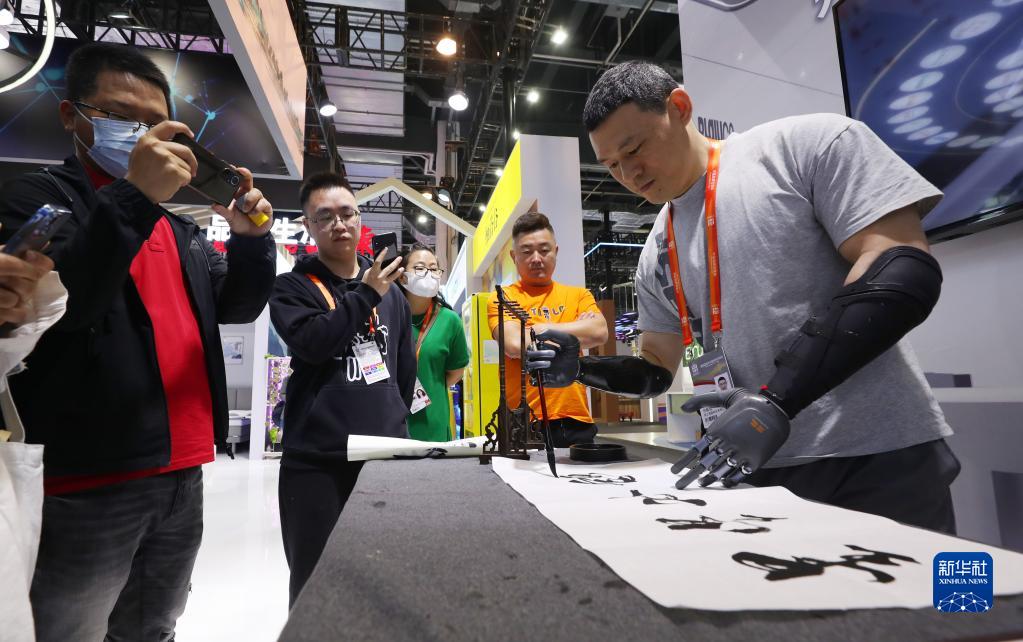 5月10日,在浙江省品牌推介展臺上,一名工作人員展示采用腦機科技操控的假肢寫(xiě)書(shū)法。