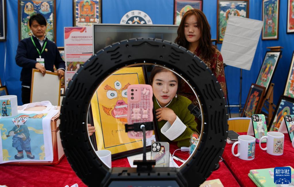 5月10日,西藏技師學(xué)院學(xué)生直播展示師生制作的手工藝品。
