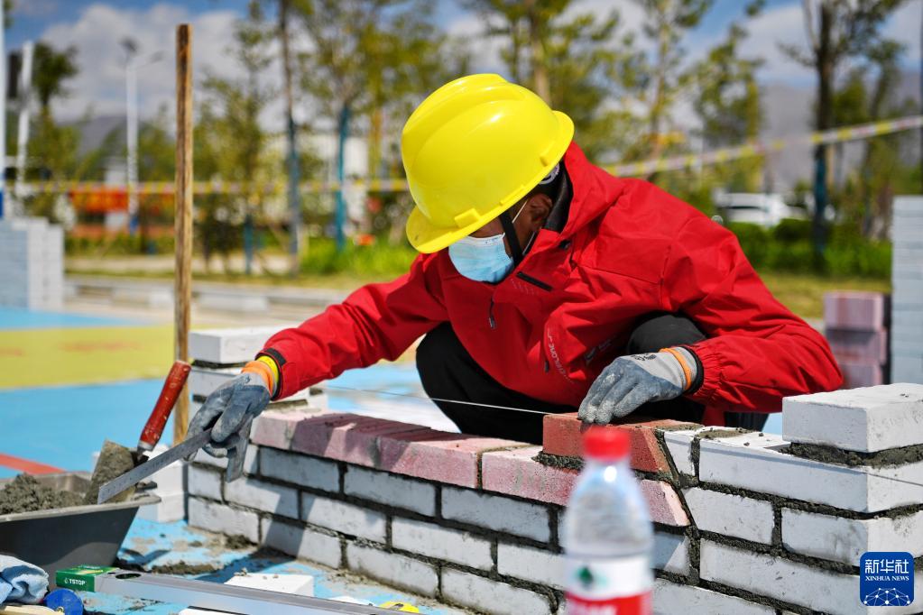 5月10日,在西藏技師學(xué)院比賽場(chǎng)地,一名參賽選手在砌筑比賽中。