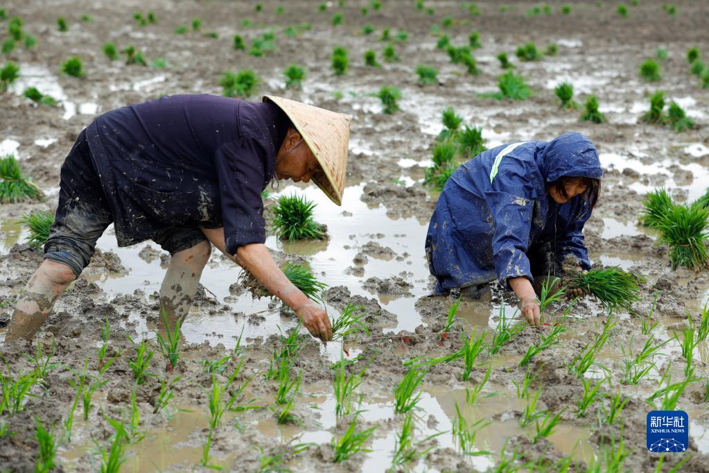 5月9日,在四川省崇州市道明鎮協(xié)和社區,農民在一片高標準農田里種植水稻。