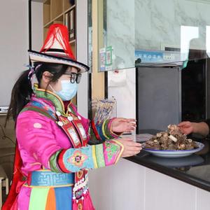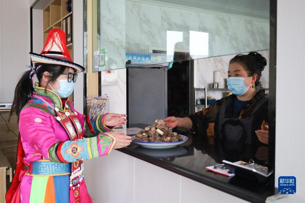 5月9日,在甘肅省張掖市肅南裕固族自治縣大河鄉西岔河村,裕固族村民在自家牧家樂(lè )為客人上菜。