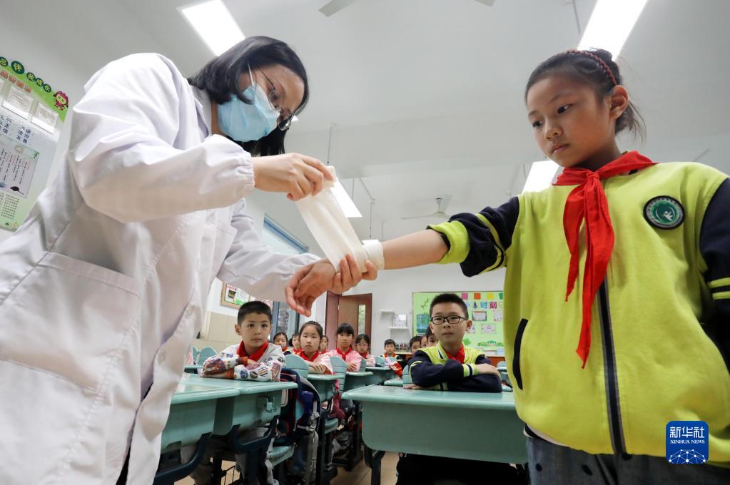 5月10日,在江蘇省蘇州市金閶實(shí)驗小學(xué)校,校醫給學(xué)生講解包扎的方法。