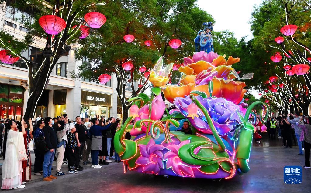 西安大唐不夜城進(jìn)行的花車(chē)巡游(4月25日攝影)。