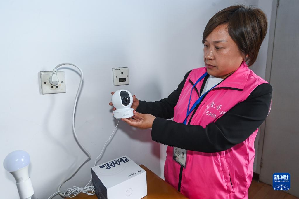 5月11日,在杭州市臨安區錦北街道龍馬村70歲的獨居老人郭香娣家里,助老員查看攝像頭的運行情況。