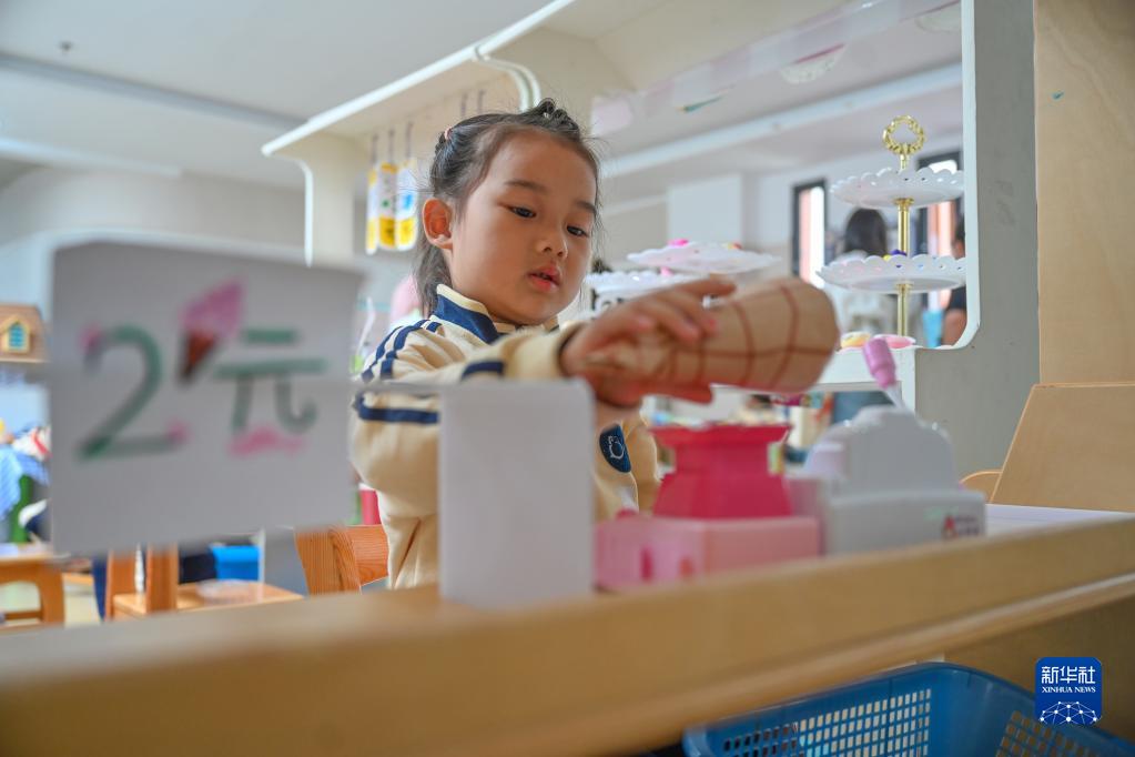 5月11日,在福建幼兒師范高等專(zhuān)科學(xué)校附屬第一幼兒園,一名學(xué)前兒童在游園活動(dòng)中模擬經(jīng)營(yíng)店鋪。