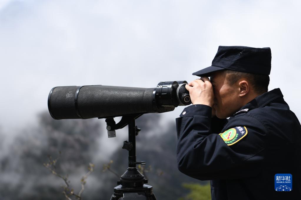 4月20日,在黃山風(fēng)景區,瞭望哨防火小隊隊員汪新平在用望遠鏡觀(guān)測山林。