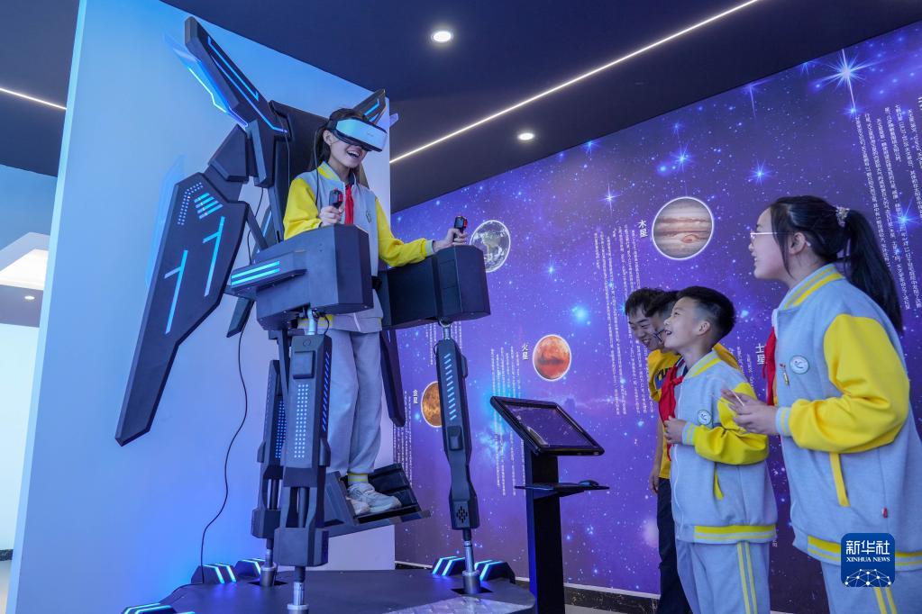 5月11日,小學(xué)生在馬店村科普體驗中心內體驗VR科普展品。