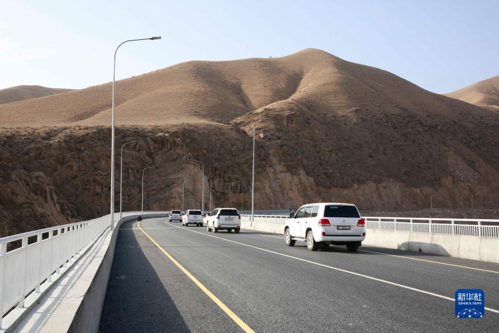 2021年11月10日,汽車(chē)行駛在吉爾吉斯斯坦新北南公路二期工程的一座大橋上。新華社發(fā)(羅曼 攝)