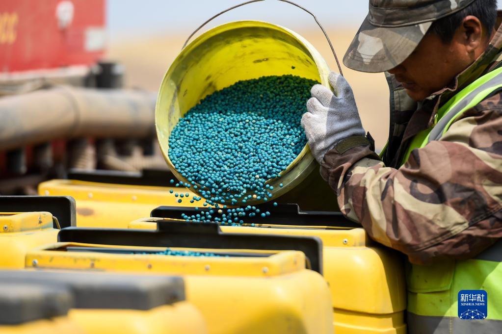 5月11日,呼倫貝爾農墾大河灣農牧場(chǎng)有限公司工人將大豆種子加入播種機械。