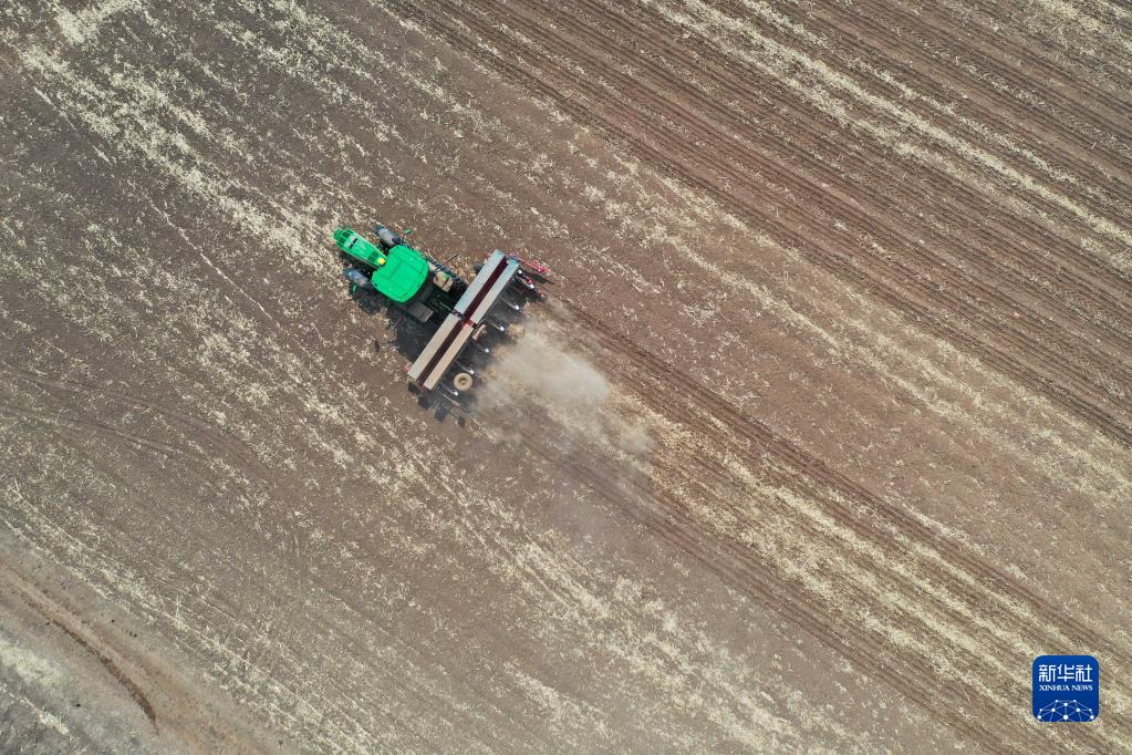 5月11日,呼倫貝爾農墾大河灣農牧場(chǎng)有限公司工人操作播種機械進(jìn)行大豆播種作業(yè)(無(wú)人機照片)。