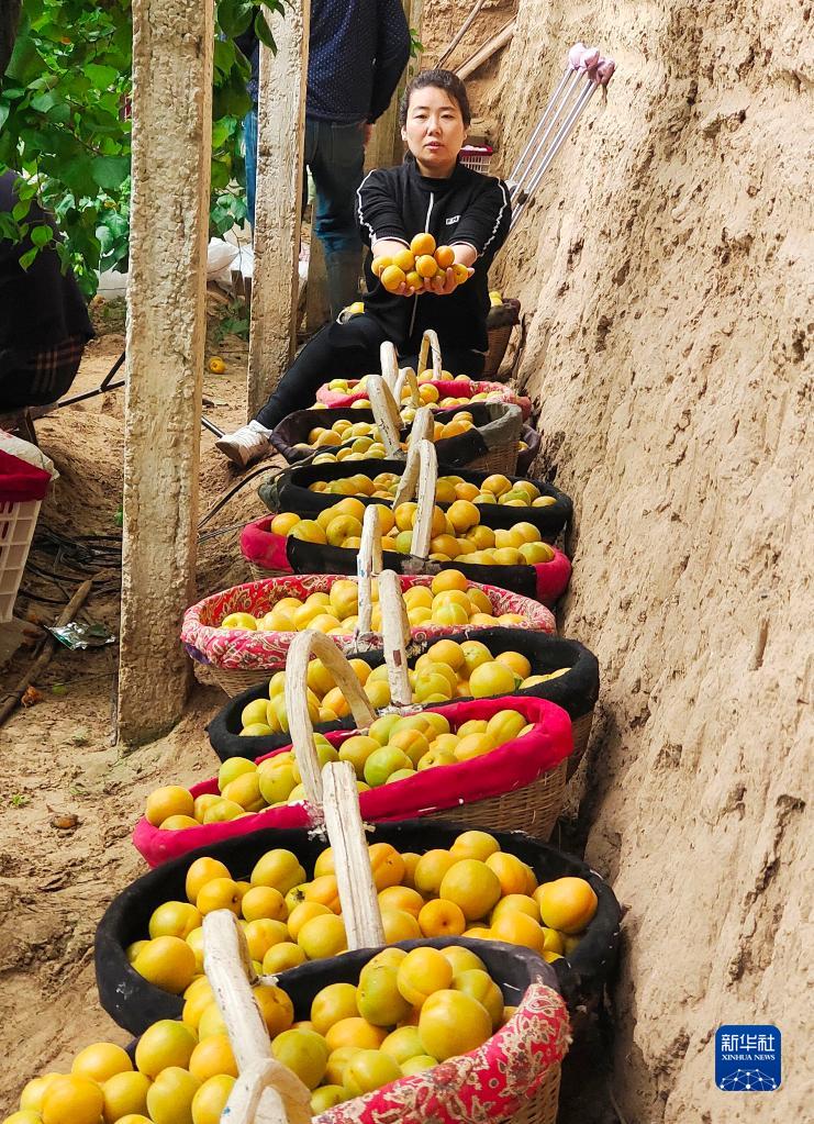 馬寧在陜西省渭南市大荔縣埝橋鎮孟家村溫室大棚直播賣(mài)大黃杏(2021年3月31日攝)。