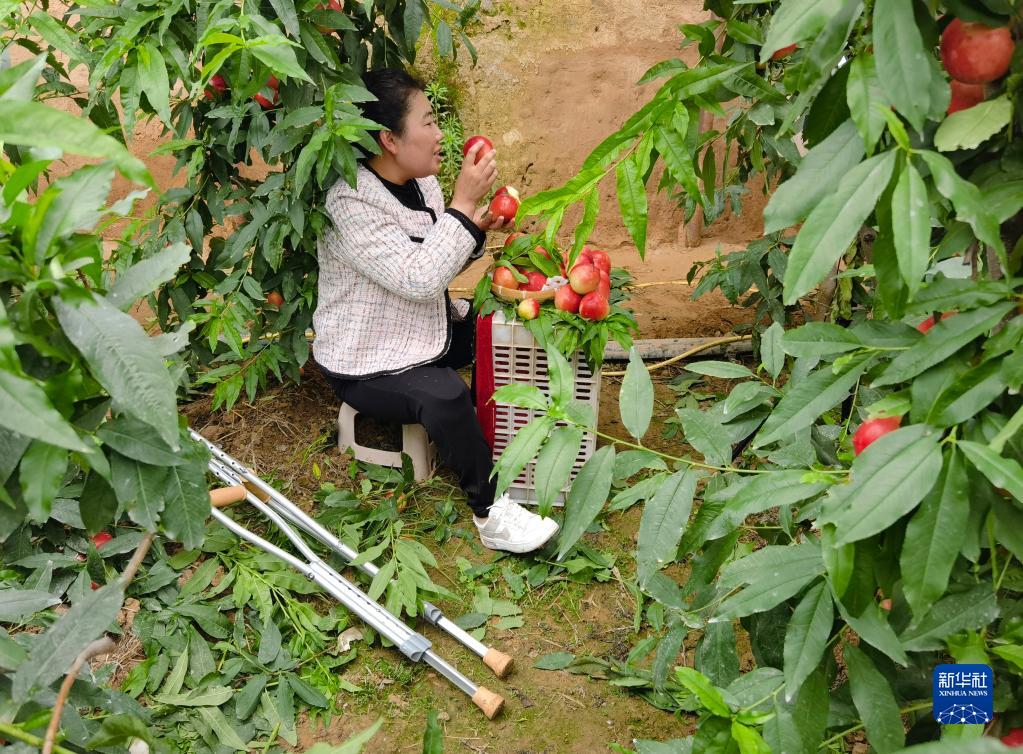 5月10日,在陜西渭南市大荔縣埝橋鎮北黃村油桃大棚,馬寧在網(wǎng)上做直播帶貨售賣(mài)油桃,她的拐杖就放在地上。