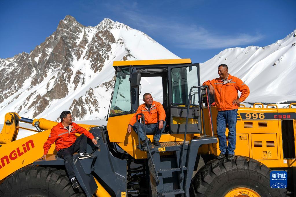 烏蘭薩德克養護站工人宋雪嶺(左)、烏斯曼·巴克(中)、亞力坤·賽買(mǎi)提在哈希勒根隧道附近的合影(5月10日攝)。烏斯曼自建站起入職,已年近六旬,一直守護獨庫公路,是宋雪嶺、亞力坤兩人的師傅。