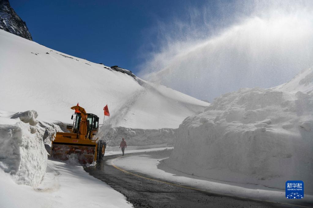 烏蘭薩德克養護站工人亞力坤·賽買(mǎi)提駕駛拋雪機清理獨庫公路上的積雪(5月10日攝)。