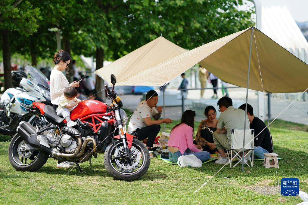 市民在西安灞河岸邊的公園內露營(yíng)休閑(2022年5月15日攝)。
