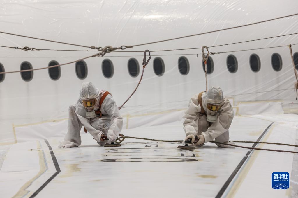 5月11日,在海南自貿港一站式飛機維修產(chǎn)業(yè)基地內,噴涂作業(yè)員對一架空客A350-900寬體客機進(jìn)行噴漆打磨工作。完成整機噴涂后,這架飛機將從??诿捞m國際機場(chǎng)飛往西班牙首都馬德里完成交付。據悉,這是海南自貿港一站式飛機維修產(chǎn)業(yè)基地投產(chǎn)以來(lái)承接的首單空客A350機型飛機整機噴涂業(yè)務(wù)。