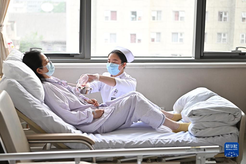 5月11日6時(shí)許,北京協(xié)和醫院基本外科四病房護士李婷為術(shù)后患者傾倒頸部引流液。